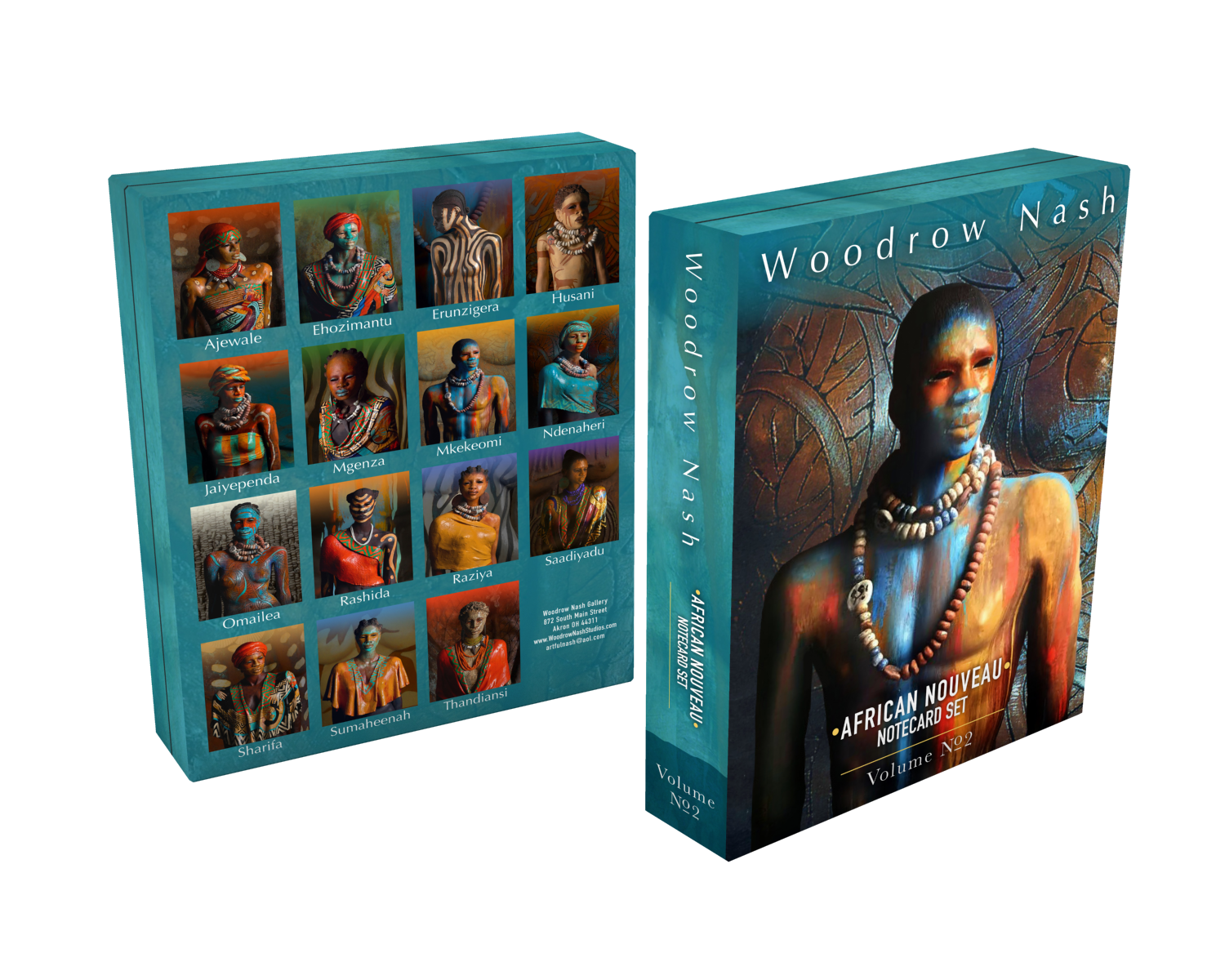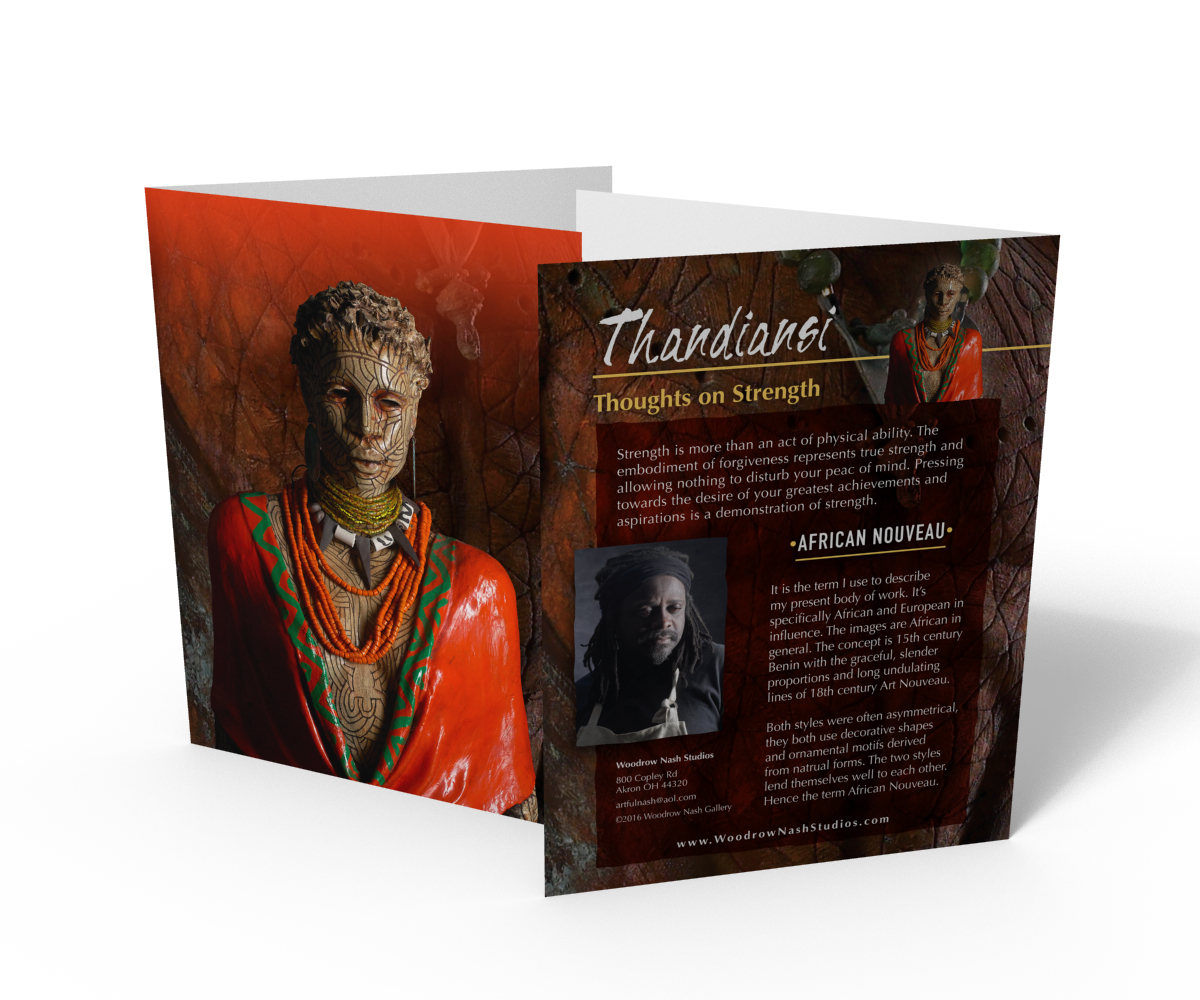 Each card features a brief bio and image of Woodrow Nash, along with a personal testament specific to each of the 15 sculptures.